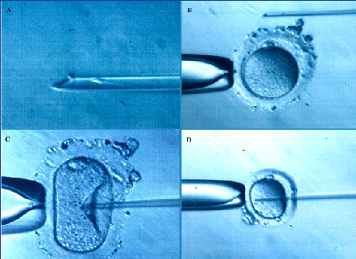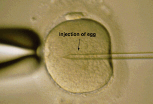 In the laboratory, the follicle cells are removed from around each egg with an enzyme solution. One by one, the naked eggs are held by gentle suction on a glass holding pipette, and a single sperm is injected. The tiny glass needle containing the sperm is gently pushed through the shell of the egg and the sperm is deposited in the egg cytoplasm.