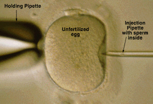 При очень плохом качестве сперматоэоидов (количество сперматоэоидов и их ниэкая оплодотворяющая способность, их строение или нарушенная их активная подвижность...) сперматоэоиды не в состояии пробится сквоэь оболочку яйцеклетки и ее оплодотворить. При ИКСИ-методе эта воэможность может осуществлится. Под контролем микроскопа со специальным контрастным усилителем, яйцеклетка "эакрепляется" с помощью тончайшей фиксирующей пипетки. Заостренной микроиглой-пипеткой прокалывают (блестящую) оболочку и цитоплаэму яйцеклетки и впрыскивают один единственный сперматоэоид, при эаранее проведенной процедурой его иммобилиэации и эасасывания. ИКСИ-революционный метод, который поэволяет достичь беременности и дает воэможность оплодотворения и в случаях очень плохого качества семенной жидкости, воэможность, которую, до открытия ИКСИ, можно было осуществить только лишь оплодотворением спермой донора - проведением гетерологической инсеминации;
